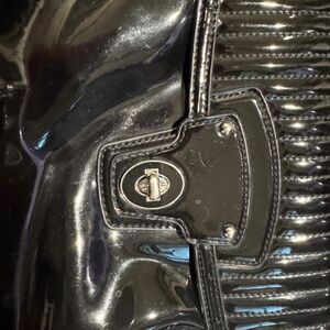 Gorgeous Black Patent Leather quilted purse with magenta interior. Silver hardware. 12” x 12”. Slightly used.