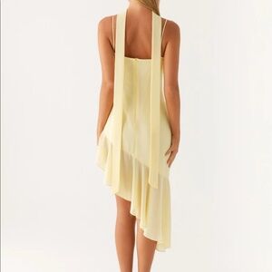 Asymmetrical Midi Dress with front cut-out and flare hemline. Neck scarf included. 100% Polyester. Never worn!
