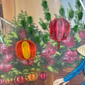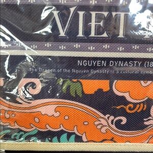 Vibrant colorful gift set includes fabric tote bag with colorful Nguyen Dynasty of Vietnam Dragon, single notecard featuring a Hoi A scene with 3D figures and lanterns, and 2 bamboo magnets with Vietnam village and water scenes. All brand new in package, never used. The text on the front of the tote bag under Vietnam reads “The dragon of the Nguyen Dynasty is a cultural symbol imbued with Vietnamese identity.” The design is the same on the front and back of the bag. Bag is approx 12” by 15.5”. Note card includes an envelope and if approx 6” by 6” square. Purchased in Vietnam.