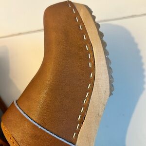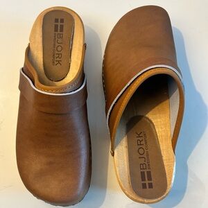 BJORK Maja Brown Leather Mule Clog with Wooden Sole Open Back Sz 39 8-8.5