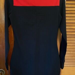 New with tags. Black and red embroidered logo v-neck dress. Long cuffed sleeves. Fits like a small imo.