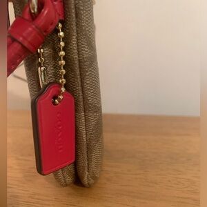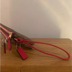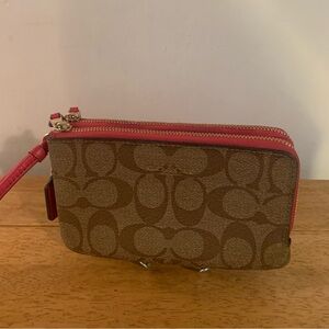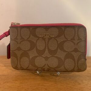COACH Signature Leather Canvas Double Zip Wristlet F66506 Khaki Bright Pink EUC