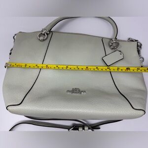 This Coach Kacey shoulder bag in a chic sage green color combines elegance with functionality. Featuring a detachable shoulder strap and a minimalist design, it offers versatility for any occasion. The high-quality pebbled leather and silver-tone accents add a touch of sophistication to your ensemble. Zippered Back pocket and inside pocket. Great condition