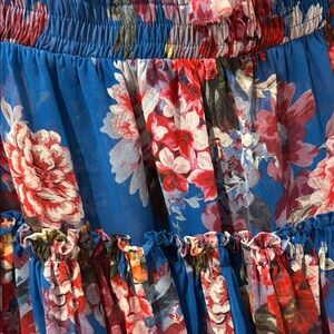 Vibrant blue dress with floral patterns. Features a sleeveless design and ruffled details. Size L