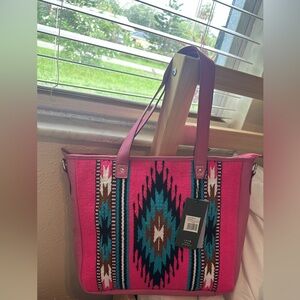 This crossbody bag features a striking combination of pink and orange hues, adorned with intricate geometric patterns. The bag's design is enhanced by decorative tassels, adding a playful touch to its vibrant appearance. Perfect for adding a splash of color to any ensemble, this bag is both stylish and functional.