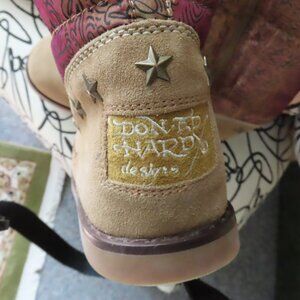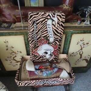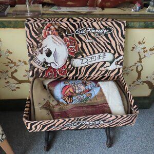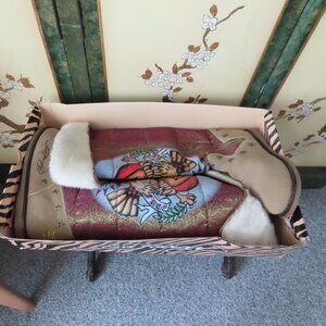 OLDER BOOTS BUT NEVER BEEN WORN, THEY ARE NEW WITHOUT TAGS, IN ORIGINAL BOX, AS YOU CAN SEE THE CORNERS ON THE TOP OF THE BOX ARE SPLIT, THE BOOTS ARE IN EXCELLENT CONDITION AS THEY HAVE NEVER BEEN WORN, OTHER THAN A TRY ON IN THE SHOW ROOM, THEY ARE A SIZE 9, WITH METAL STARS STUDDED IN THE LOWER PART, THE FUR IS FAUX. ED HARDY NEVER WENT OUT OF FASHION, WEAR THESE NO MATTER WHAT AGE OR LOCATION AND YOU WILL BE HIP, COOL AND STAND OUT FROM THE CROWD AT THE SKI RESORT, THE PUB OR THE HOTTEST CLUB IN MILAN....YOU SEE USED ONES LISTED FOR THE PRICE I AM ASKING FOR NEW.