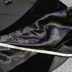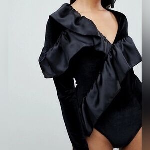 RIVER ISLAND Velvet Ruffle Bodysuit. River Island black velvet bodysuit with Satin Ruffle detail across front and back. This Stretch Velvet Bodysuit with Satin ruffle trim styled at sleeve and around body for glam look - provides a option for an occasion that is comfortable to wear.