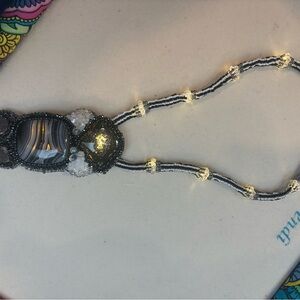 Unique handcrafted pendant with intricate beadwork. Features black, gray, and gold tones. Perfect for adding elegance to any outfit. this hand beaded necklace with an agate and drusey stones it’s fun to wear if you want. Use the light up option to grab attention of everybody around the light switches on the back so you can turn it on and off. It will very unique one-of-a-kind necklace goes with mostly everything since it’s black, gray and white.