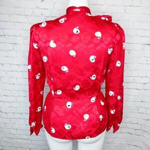 FAB-U-LOUS! Beautiful vintage secretary blouse from Anne Klein for new aspects. Silky red top with pear (?) print, hidden button front, attached long piece for bow or tied up, shoulder pads (can be easily snipped out), long sleeves w/ buttons on ends. Excellent condition. Size 12, 100% polyester. Measurements: 21" pit to pit, 32" waist, 25.5" long.