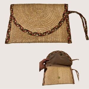 Discover the elegance of this handcrafted Colombian straw clutch. Featuring a beautiful tan base with red accents, this bag is perfect for any occasion. Embrace the artisanal charm and add a touch of color to your outfit.