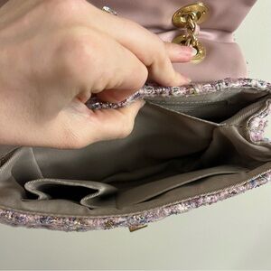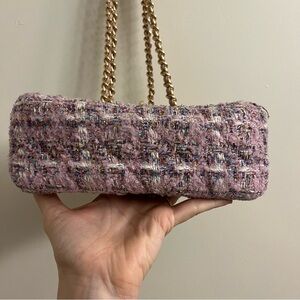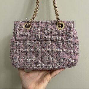 Pink color convertible crossbody bag that can be worn with short or long strap; gold hardware, sparkly glittery tweed Boucle fabric