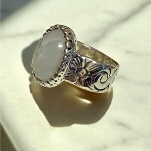 This elegant silver ring features a beautiful floral design, perfect for adding a touch of sophistication to any outfit. The silver color gives it a timeless appeal.