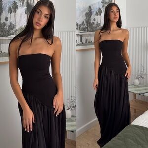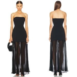 HELSA’s Sheer Ruffled Long Orange dress features a square neckline with tie detail and maxi length hem.