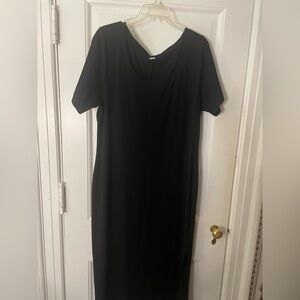 This sleek black sheath dress from Old Navy features a round neckline and short sleeves, making it perfect for both casual and work settings. Its minimalist design and clean silhouette offer a versatile style that can be easily dressed up or down. Added design creature with a low slit on the left side. Ribbed knit material that is stretchy and soft. Pair this with some flashy accessories for an added pop of color.