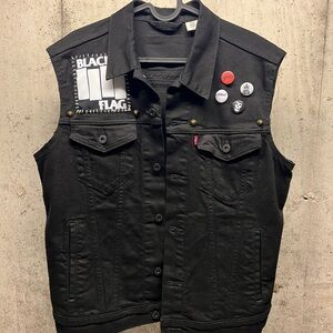 Brand new medium studded punk vest with large Crudos back patch and copper quarter inch cone studs up the back sides. The front features a large black flag screened patch and vintage Van Halen and Randy Rhoads pins. There is also a misfits 1 inch band pin and an Ozzy enamel pin. All patches are hand sewn.