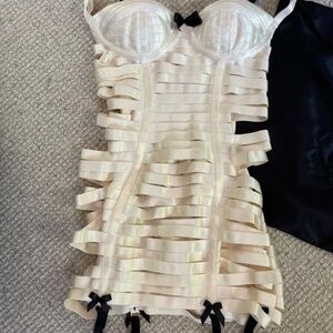 The iconic Bordelle underwired lingerie dress showcases contouring satin elastic in ivory and black. Features bow detailing, removable garters, adjustable straps, and a beautiful gold zipper. Rare to find this piece in the ivory and black combo. Such a stunning contrast look, especially with Wolford stockings. Never been used.