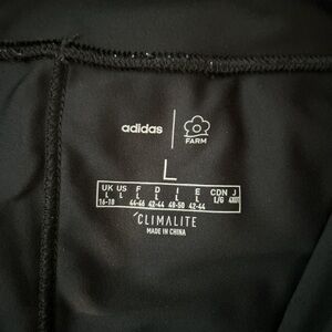 Chic black leggings with floral side panels. Features adidas stripe accents. Ideal for play and comfort. Excellent condition, women’s size LG, says adidas on the front.