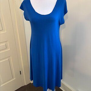 Lightweight pullover dress with elasticized three-quarter sleeves and tied neckline in nutmeg brown with tiny cream- and chestnut-colored allover floral design. Fabric is 100% Rayon with a crinkle texture. Size Medium with measurements taken flat and unstretched: Bust 17", Sleeve Length 11", Length from Underarm to Hem 24", Length from Shoulder to Hem 33". In excellent preowned condition.