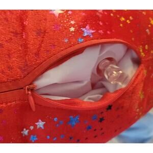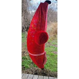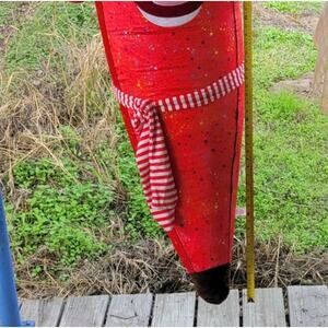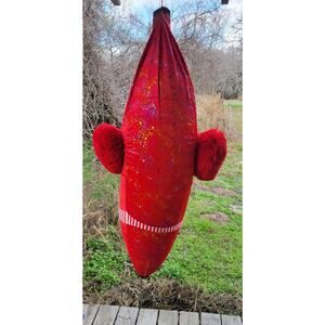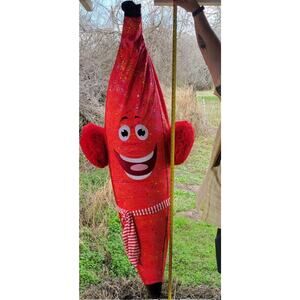 HBL Jumbo Inflatable Fabric Covered Banana Carnival Prize Huge 75 In. Tall. This big banana is wearing earmuffs and a scarf. Bright sparkling stars cover ghe red material. This is the holiday version of this carnival prize. In great condition. No leaks. Left inflated for 3 days for testing. Did not deflate at all. Great as a gag gift or for a birthday party. Just fun to have. Measures approximately 24 inches across. Zip closure in back.