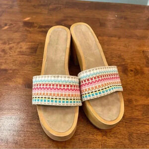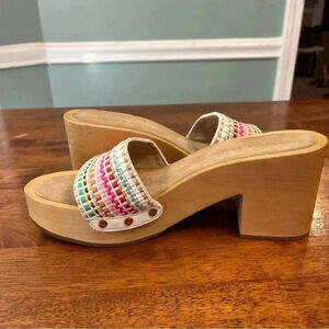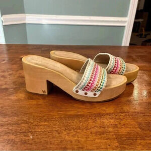 Colorful stripe design. Studded trim. One spot on bottom of shoes. Wooden block heel