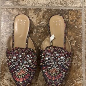 Step out in style with these embellished slip-on shoes. Featuring a vibrant multicolor design, they are perfect for adding a pop of color to any outfit. The intricate detailing and comfortable fit make them a must-have for your wardrobe.