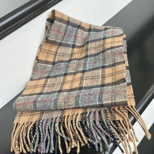 Barbour 100% Lambs Wool Scottland plaid tan unisex scarf fringe clean no smoking
