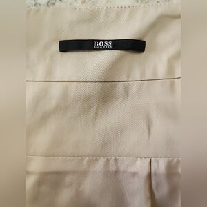 The is a high waisted skirt in a beautiful khaki color by HUGO BOSS Black Label. Made of a cotton blend with a bit of elastane, this pencil straight skirt features a front pleated design, zipper closure, and belt loops. It is suitable for various occasions including travel, parties, casual, workwear, and business events. The skirt is lined and is knee-length, making it a versatile and stylish addition to any woman's wardrobe.