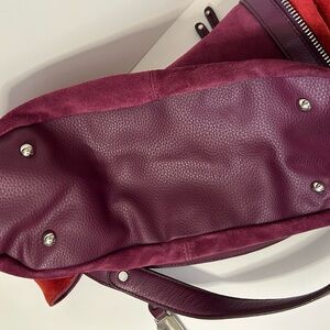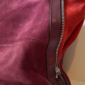 This stylish tote bag features a luxurious burgundy leather body with striking red accents. Large capacity with expandable side zippers & lots of pockets to keep all of your essentials organized. Truly a gorgeous suede bag.