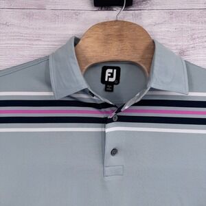 Keywords: FootJoy, golf polo, polo shirt, striped polo, performance polo, athletic polo, stretch polo, men's golf shirt, golf apparel, XL, extra large, pink polo, blue polo, golf wear, sportswear