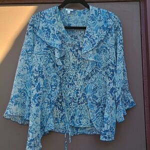 Polyester women's vintage-inspired Paisley print straight leg pants. Colors of blues and scattered oranges and greens. Non stretch but wide leg and a thick elastic waistline.
