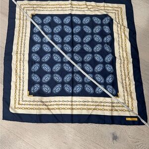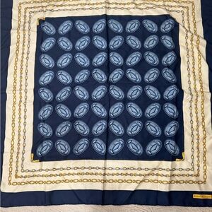 Luxurious silk scarf featuring a classic chain design. Rich navy and gold colors.