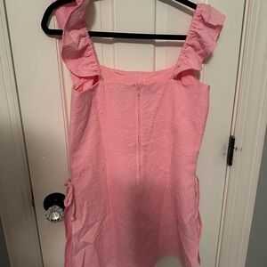 Chic pink jumpsuit with ruffle neckline. Sleeveless design. Perfect for summer outings.