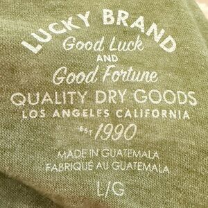 Embrace a laid-back vibe with the Lucky Brand green short sleeve tee, crafted from soft cotton for ultimate comfort. This casual crew neck shirt features a subtle circular logo, adding a touch of style to its classic design. Ideal for everyday wear, its olive green hue offers a versatile and outdoorsy aesthetic.