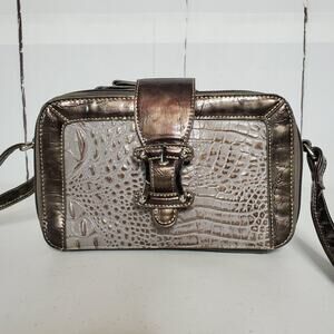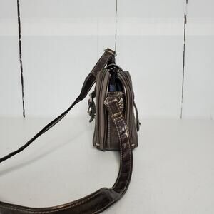 EUC: Versatile, two tone (bronze/blue) patent embossed leather organizer crossbody bag with a faux snakeskin accent/divided compartments/adjustable shoulder strap/buckle flap strap magnetic closure/silver tone hardware/contrast stitching/multiple zip & card/slot pockets/fabric lining by Marc Chantal. In excellent preowned condition with working zippers/intact seams. **Disclosure: there are minor exterior/interior discoloration marks. Please see pictures.