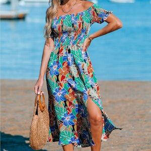 Step into resort-ready style with this Cupshe sundress, featuring a smocked bodice and flutter sleeves for a chic off-the-shoulder look. The tiered midi skirt adds a playful touch, perfect for breezy beach days or warm-weather getaways.