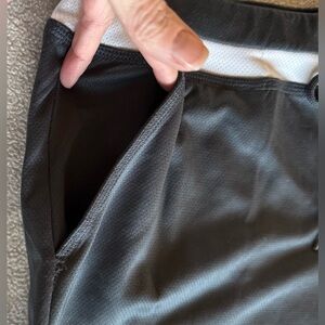 Danskin Now women’s athletic shorts. Grey with white stripe at waist. Size large (12-14). Stretch material (100% polyester) with drawstring and two front pockets. In excellent condition.