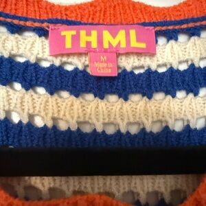 This THML sweater showcases a chic combination of blue and white stripes, enhanced by a textured knit for a casual yet stylish look. The cap sleeves and crew neckline add a touch of elegance, making it a versatile addition to any wardrobe.