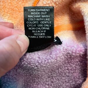 The Hot Topic Bright Rainbow Colorful Tie-Dye Cold Shoulder Hoodie in size medium is a vibrant and stylish addition to any wardrobe. This hoodie features a bright tie-dyed pattern with a crew neck and pullover closure, making it versatile for various occasions from casual wear to workwear. Made from a blend of polyester and cotton, the fleece fabric ensures comfort and warmth, while the kangaroo pocket adds a trendy accent. The relaxed fit and hooded design make it perfect for activities like walking, skateboarding, or even just running errands. Show off your colorful personality with this retro-inspired hoodie that is sure to make a statement.