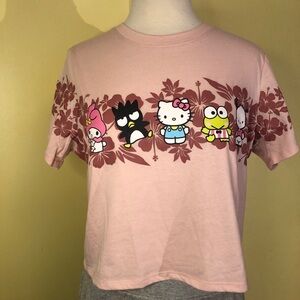 Charming pink tee with beloved Sanrio characters. Features short sleeves and playful design. Ideal for casual wear.