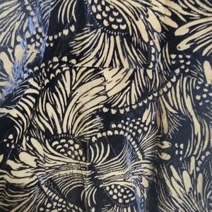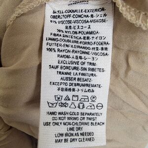 V neck with studs all the way around. Sleeveless. Tan lining with a velvet burnout overlay. Sheer (no lining) on back from neck to waist. Flounce skirt.