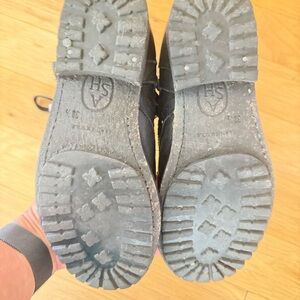 Stylish combat boots by Ash. Black leather with silver stud detailing. Lace-up front with buckle accent. Durable and edgy design. Worn but great condition. They are made to have the distressed look. One stud missing not noticeable when on. Last 2 pictures shows where it is on the inside part of the strap. Fit true to size US women’s 6.5