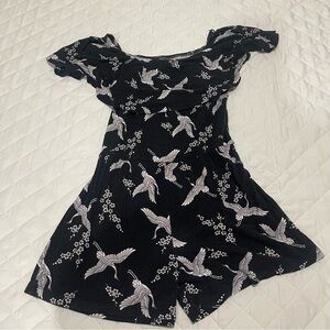 Trendy black dress featuring a white bird design. Perfect for any occasion.