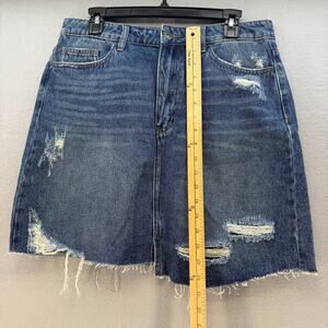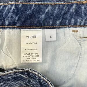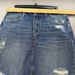 Vervet Women's Denim Mini Skirt. In the color blue. Tagged size large. This women's Vervet Claudia mini skirt features denim fabric, factory distressing, a five pocket design, and rear pockets. Style number VT676. In new with tag condition - NWT.