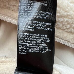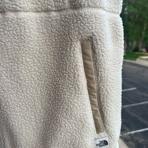 Stay cozy and stylish in this premium sherpa fleece vest by The North Face. Designed in a warm cream tone with light beige trim, this vest features: