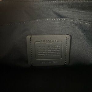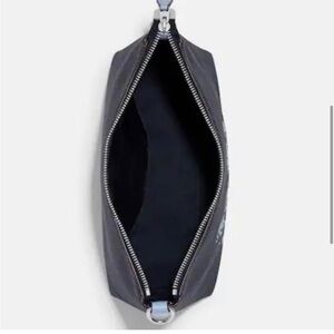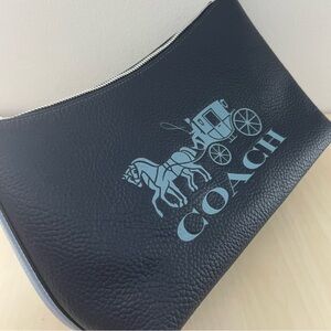 Stylish Coach crossbody bag in black. Features a bold blue logo design. Perfect for casual outings