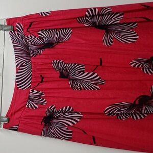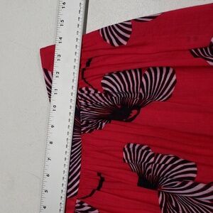 Elegant midi skirt with bold floral pattern. Features a vibrant red base with striking black and white floral designs. Perfect for any occasion.
