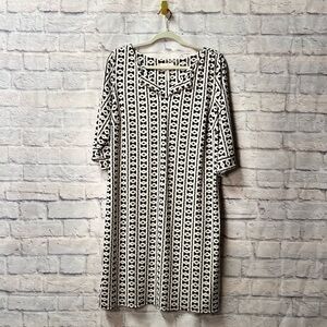 Vibrant long sleeve dress with a playful multicolor pattern. Features a round neckline and tiered design. Perfect for a bold, stylish look.