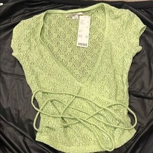 This chic green blouse from Urban Outfitters showcases a stylish wrap design with a tie front, perfect for a modern and flattering fit. The cap sleeves add a touch of elegance, while the lightweight, airy material ensures comfort and breathability. Ideal for a versatile and fashionable look, this blouse is a must-have addition to any wardrobe.