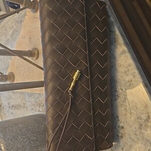Right on trend for Fall, this dark chocolate brown woven leather clutch by J. McLaughlin is gorgeous. This bag is J. McLaughlin's interpretation of the Bottega Venneta Andiamo clutch bag that lists for $3,200!!!