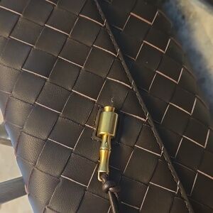 Designed in rich woven leather, the Pernille puts a unique spin on this stylish clutch with an asymmetrical bamboo style closure. The woven leather is on the outside of the bag only. The interior is just like the side of the bag - a solid piece of dark brown leather with an interior pocket.